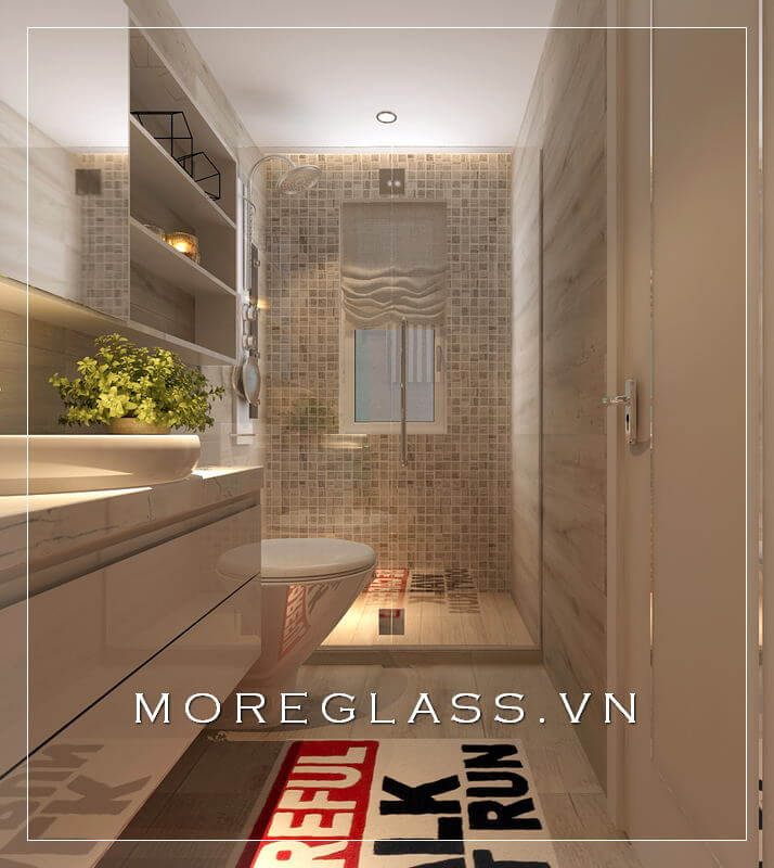 Phòng tắm hiện đại được thiết kế với những kệ tủ trang trí, tủ lavabo đơn giản nhưng hiện đại, cùng với các thiết bị vệ sinh và phòng tắm kính đẹp.