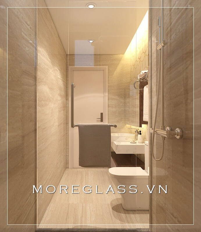 Không gian phòng tắm rộng của biệt thự, nhà phố được thêm sự hiện đại và tiện nghi bởi sự sử dụng của hệ thống kính ngăn hiện đại.