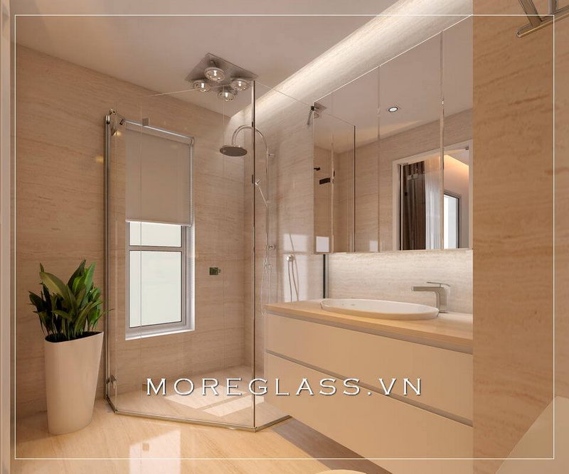 Phòng tắm chung cư được thiết kế sang trọng với kính cường lực và đầy đủ tiện nghi.