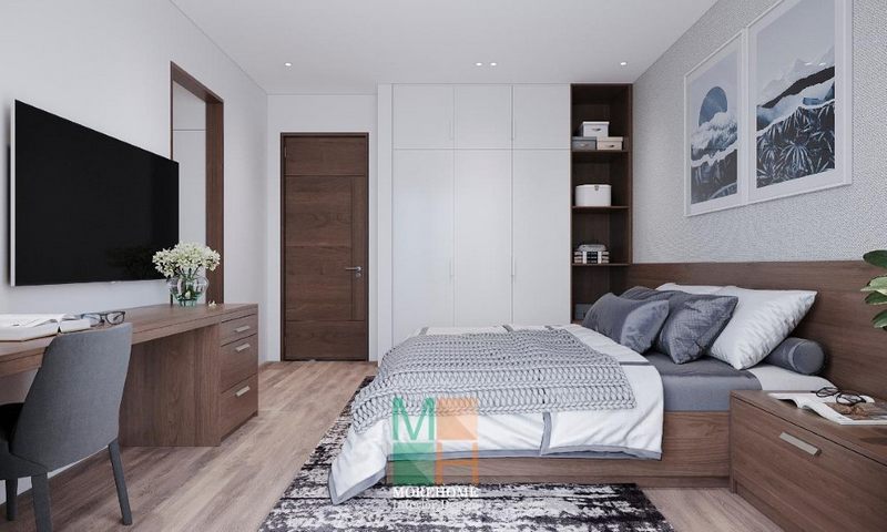 Phòng ngủ được trang bị đơn giản nhưng hợp lý bằng nội thất gỗ công nghiệp gồm tủ quần áo cánh lùa kịch trần, giường đơn, giúp tiết kiệm không gian cho phòng ngủ có diện tích nhỏ.